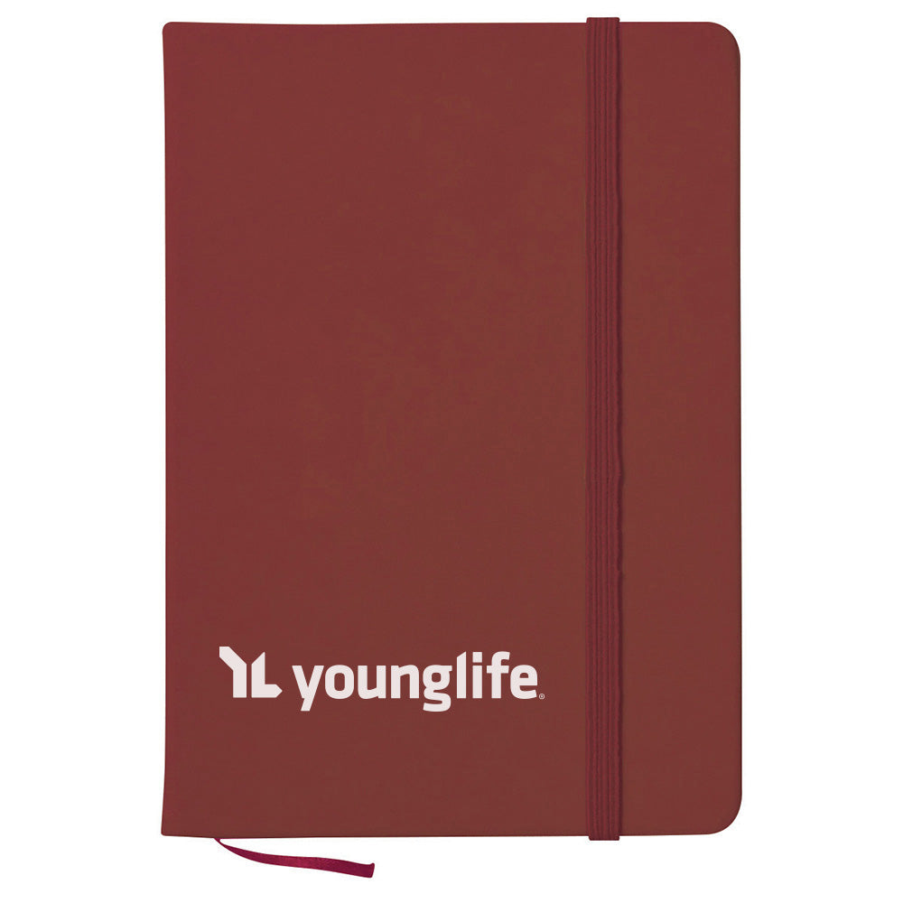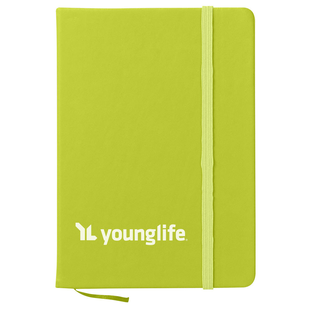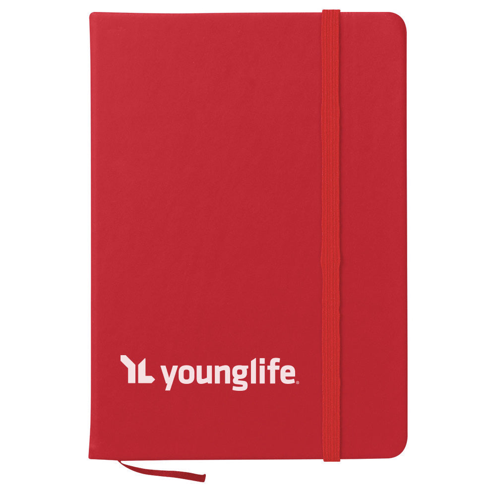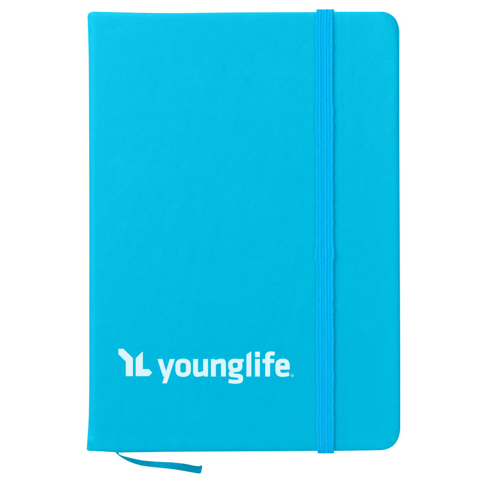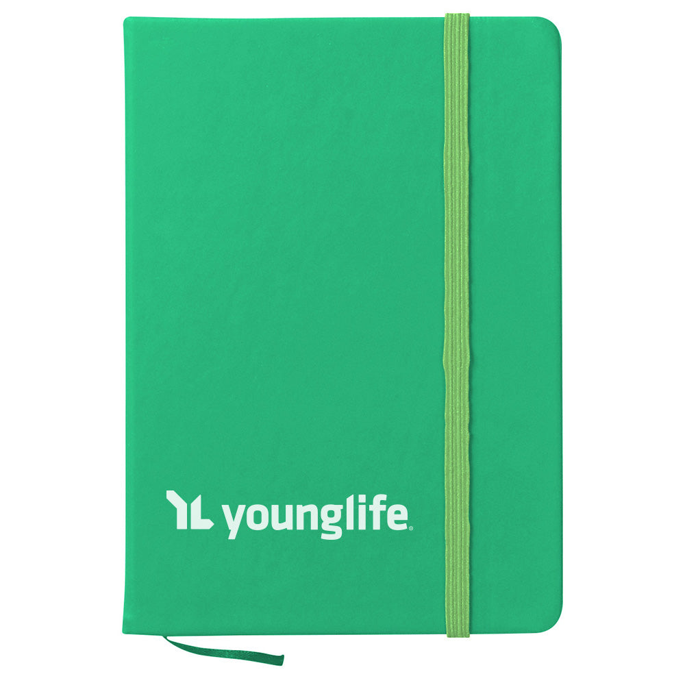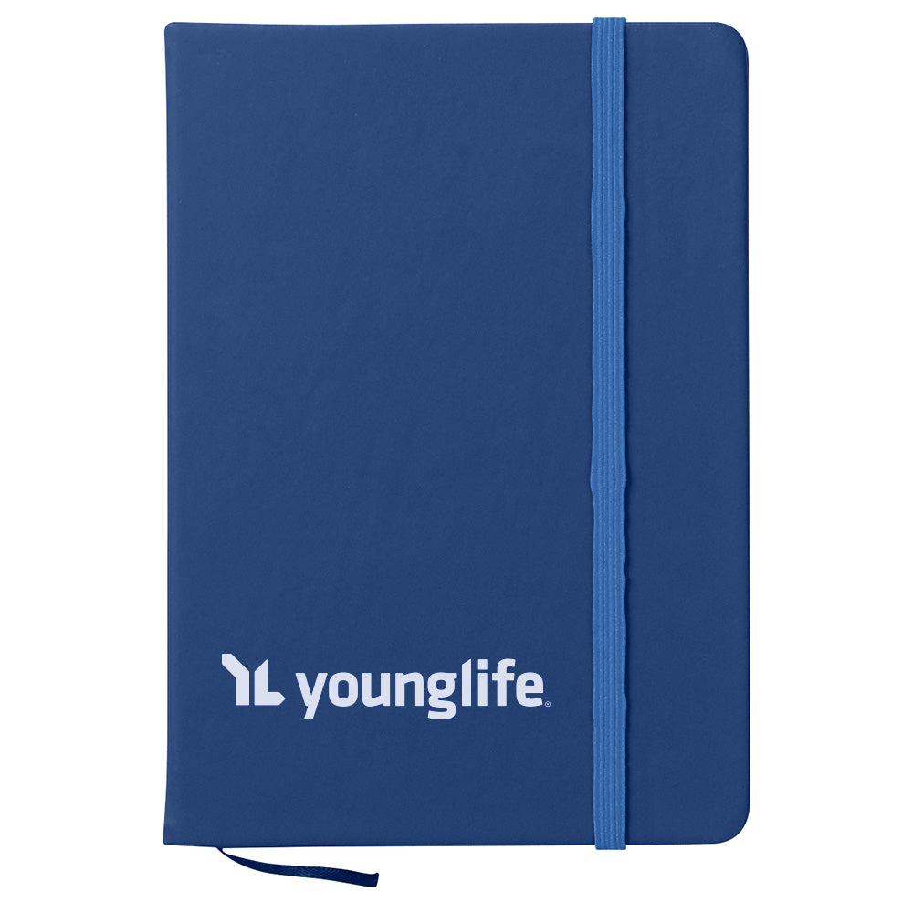 A handy journal that goes wherever you do. Thick cover with a soft PVC coating. Elastic closure strap with matching ribbon color bookmark. 80 ruled page notebook. 5" x 7". White Young Life Logo.