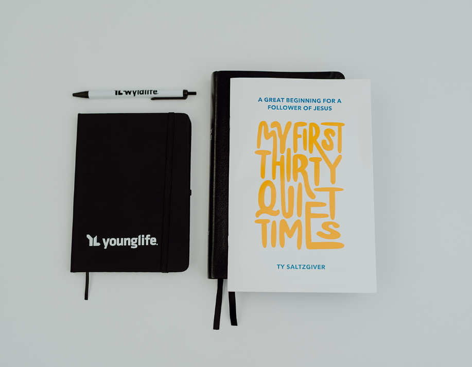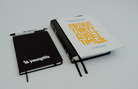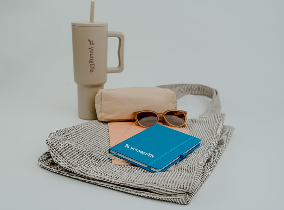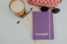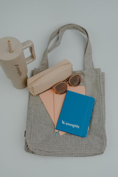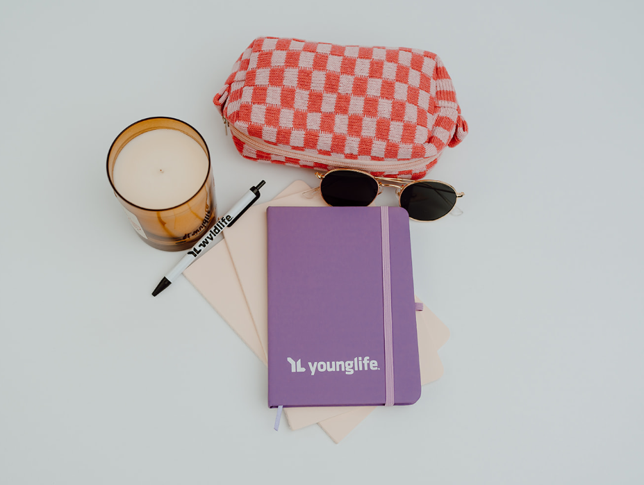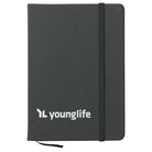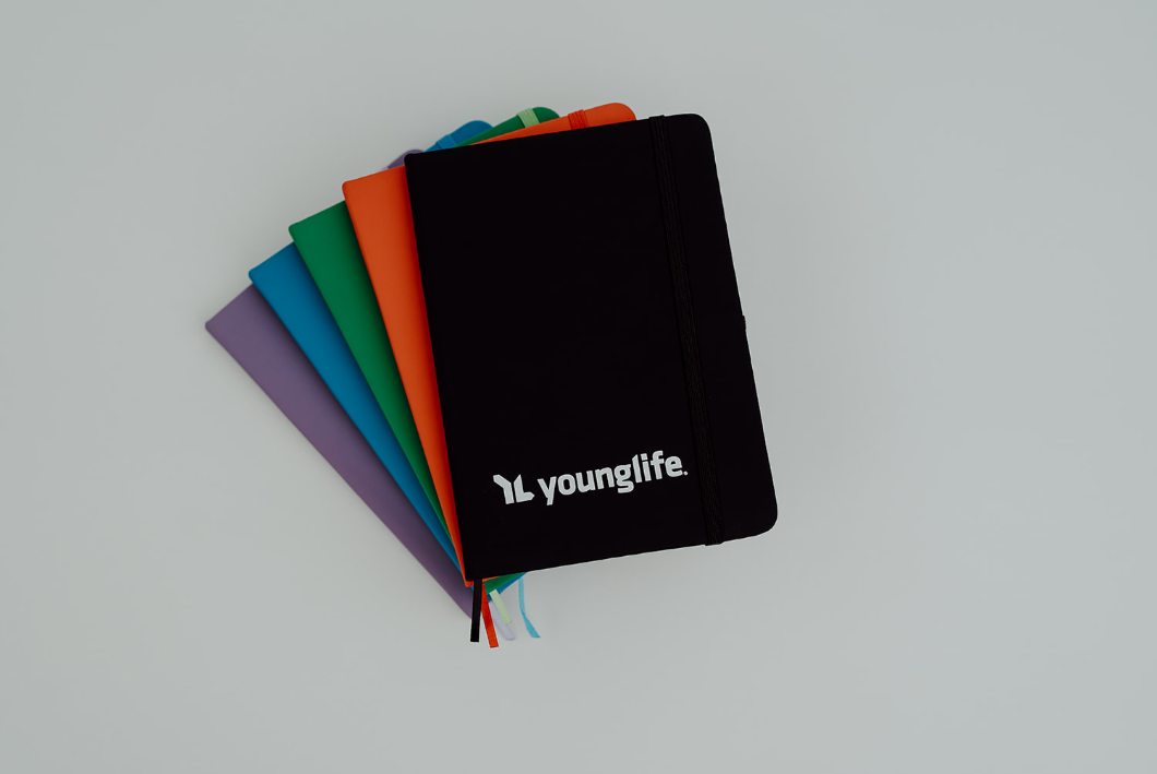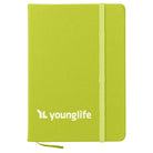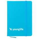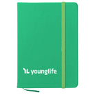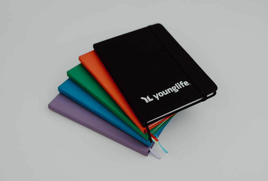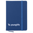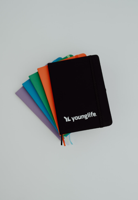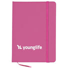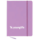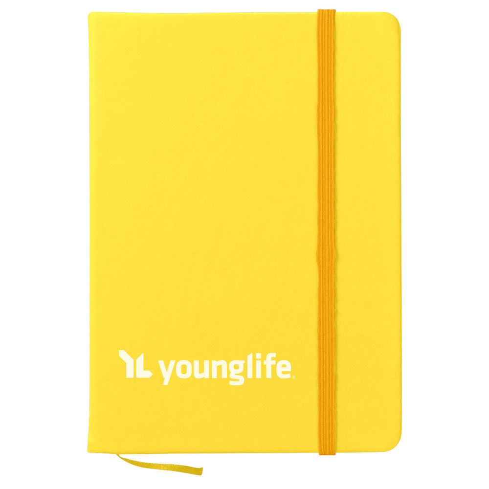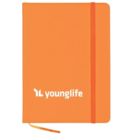 A handy journal that goes wherever you do. Thick cover with a soft PVC coating. Elastic closure strap with matching ribbon color bookmark. 80 ruled page notebook. 5" x 7". White Young Life Logo.