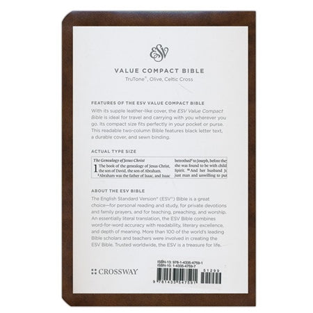 The ESV Value Compact Bible is a conveniently sized and affordably priced edition, making it practical to take God’s Word wherever you go! It's a great gift for graduation or any time. Features: