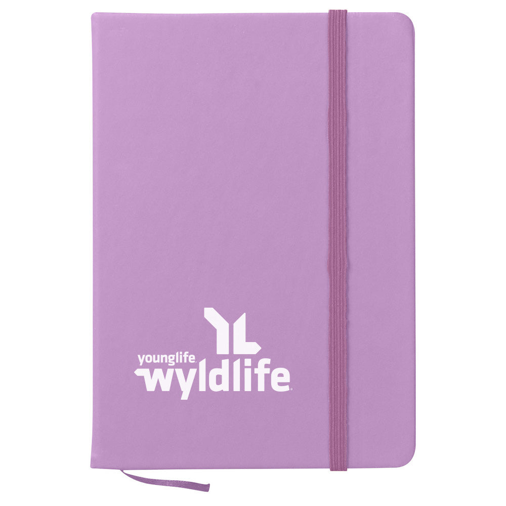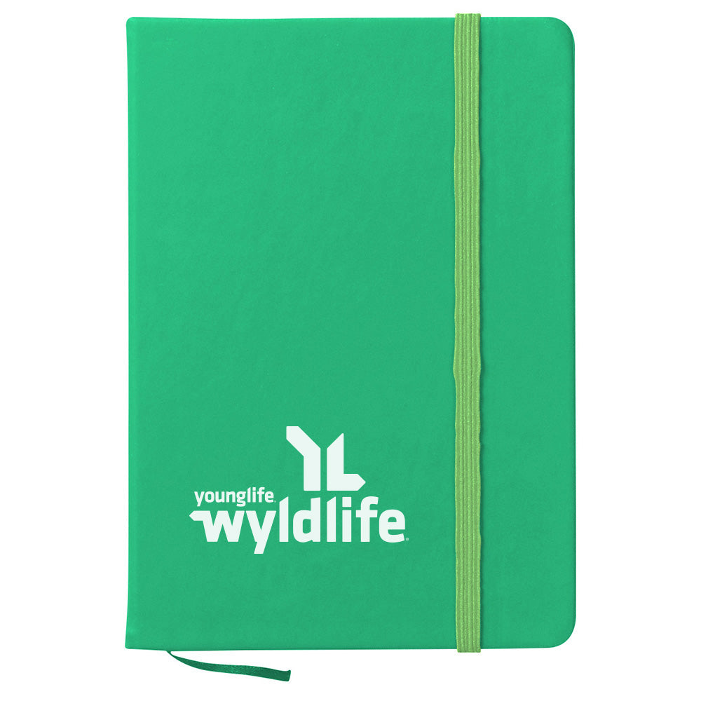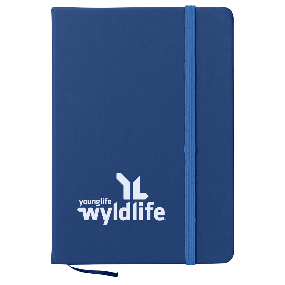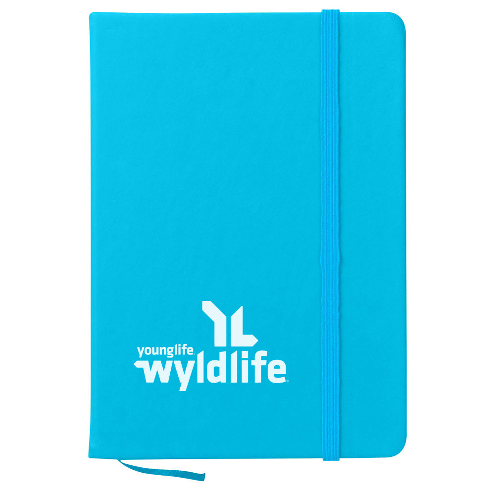A handy journal that goes wherever you do. Thick cover with a soft PVC coating. Elastic closure strap with matching ribbon color bookmark. 80 ruled page notebook. 5" x 7". White Wyldlife Logo.
