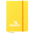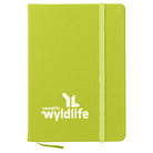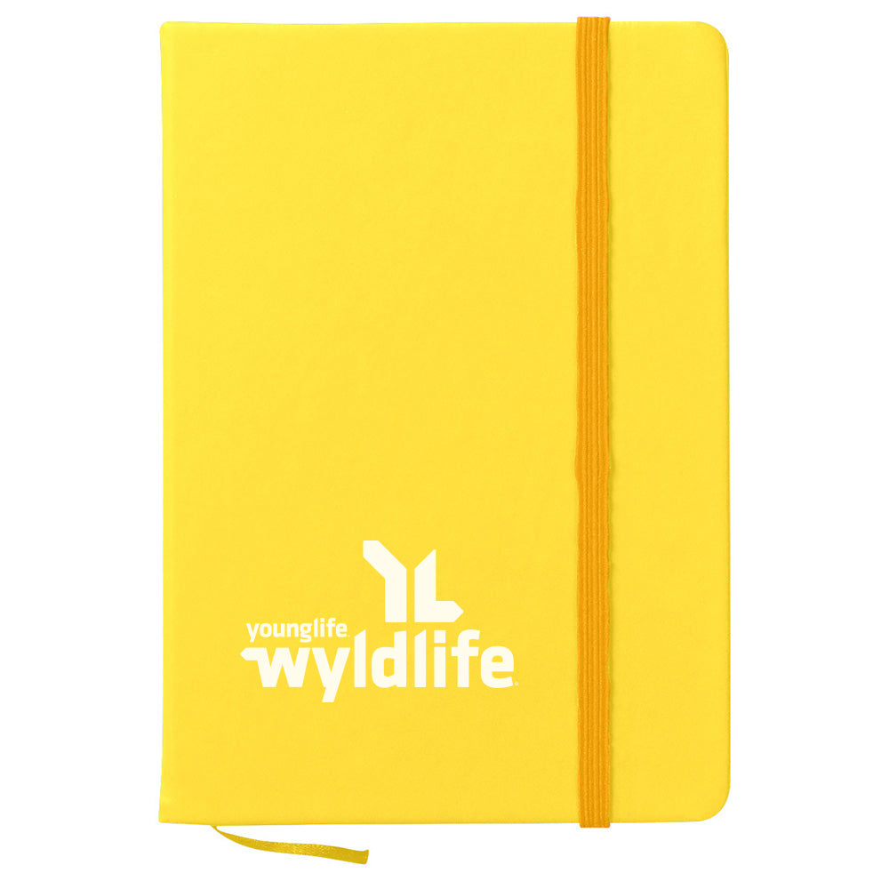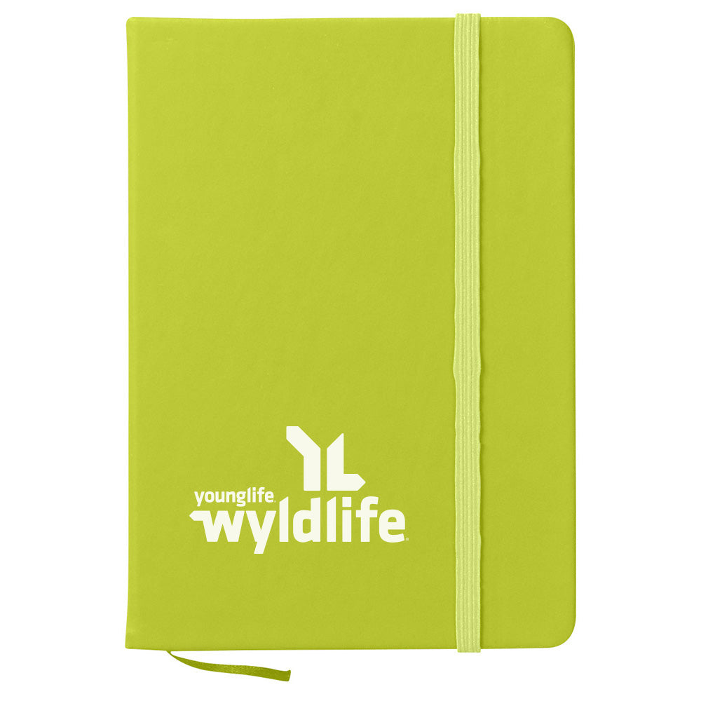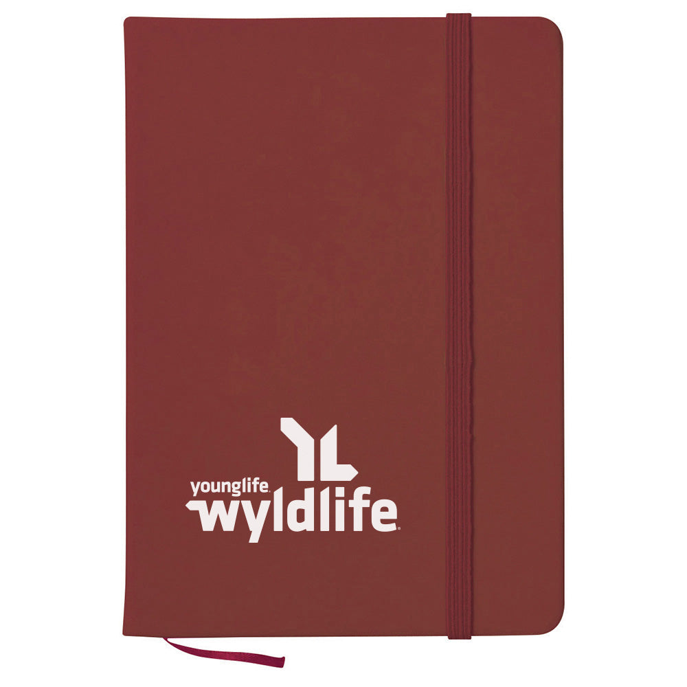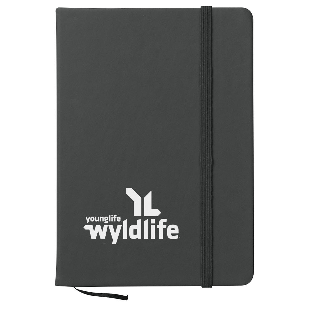 A handy journal that goes wherever you do. Thick cover with a soft PVC coating. Elastic closure strap with matching ribbon color bookmark. 80 ruled page notebook. 5" x 7". White Wyldlife Logo.