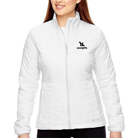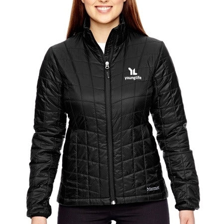 Top notch Marmot lightweight, insulated jacket with a Young Life logo just for you! Primaloft Black Insulation. Zippered hand pockets. Elastic bound cuffs. Inside zip pocket. Elastic drawcord hem. Angel-wing movement.