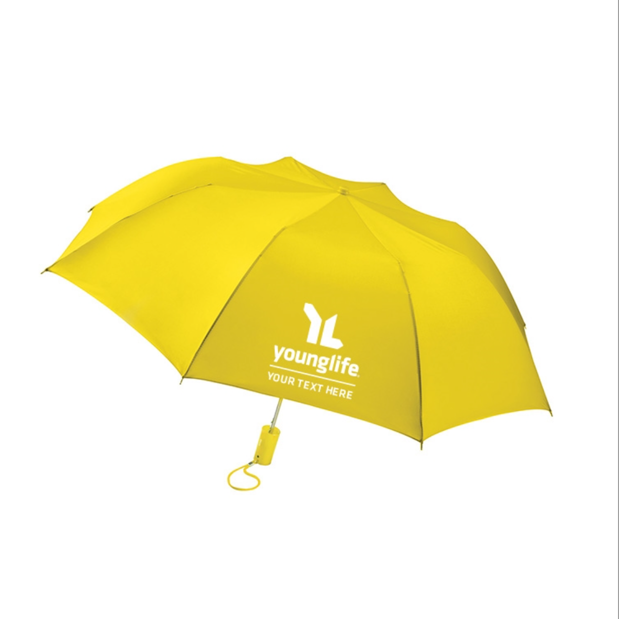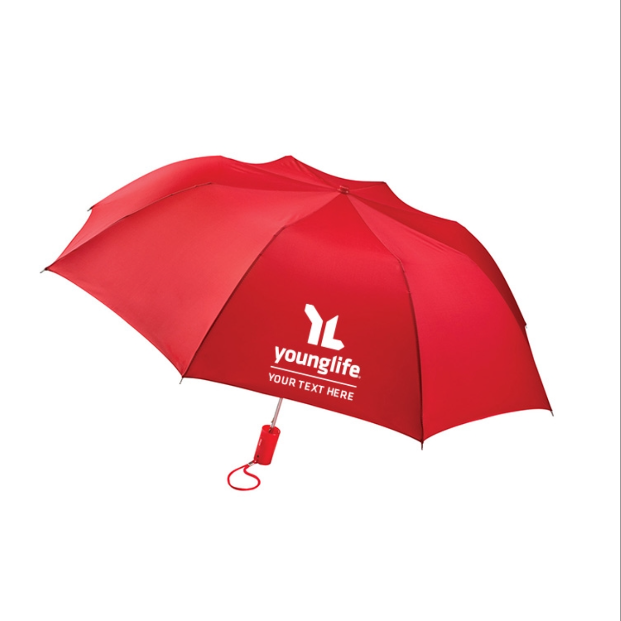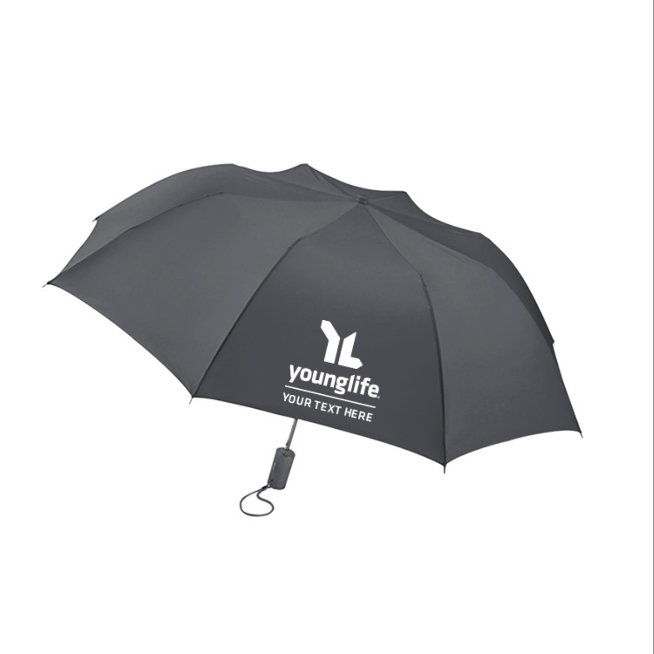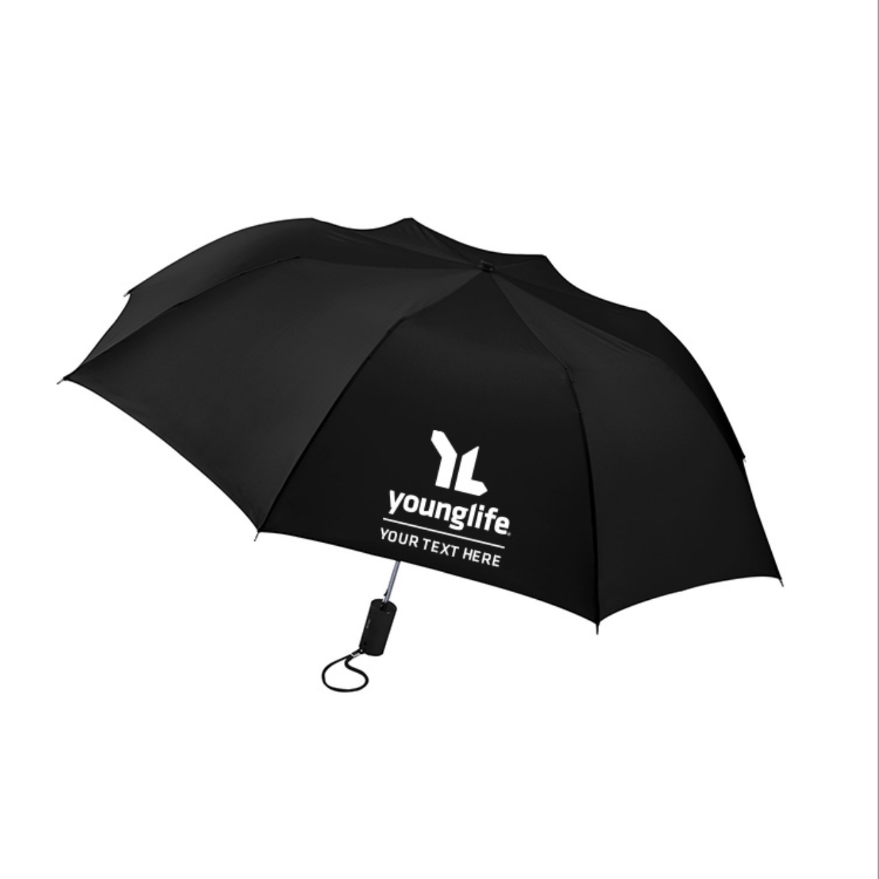 Automatic opening. Nylon canopy with matching color case. 2-section folding metal shaft. Ergonomic matte black plastic handle with wrist strap. Folds to 15" long. Features Young Life logo and customizable text.