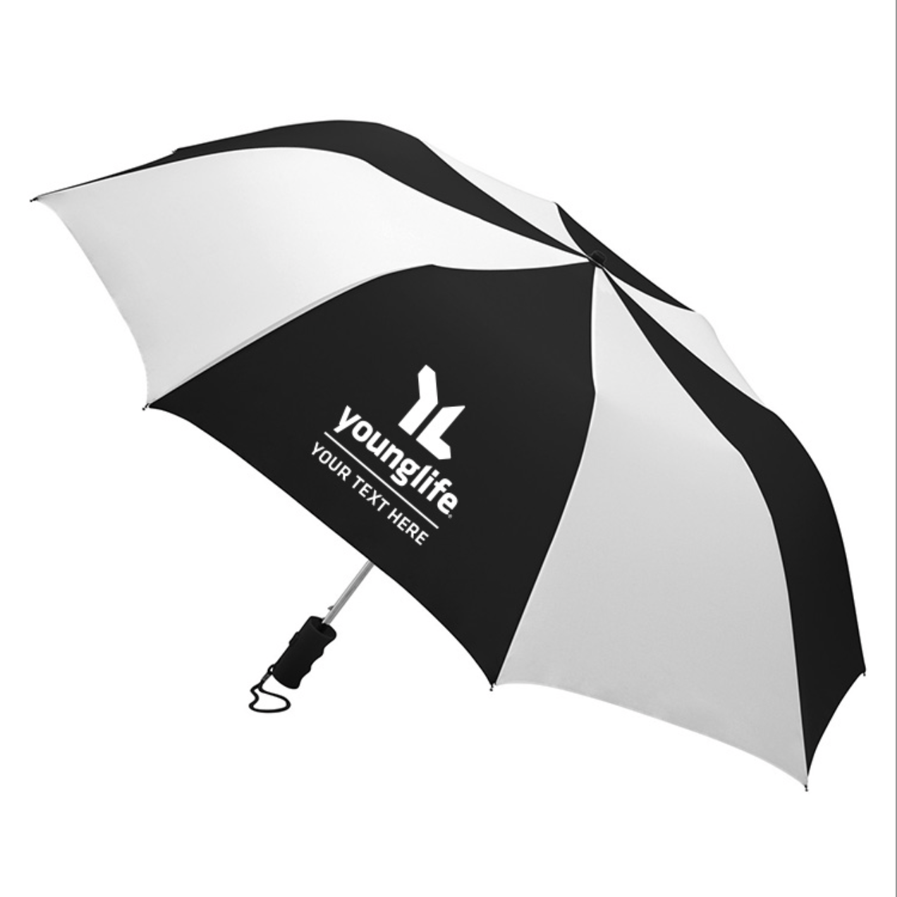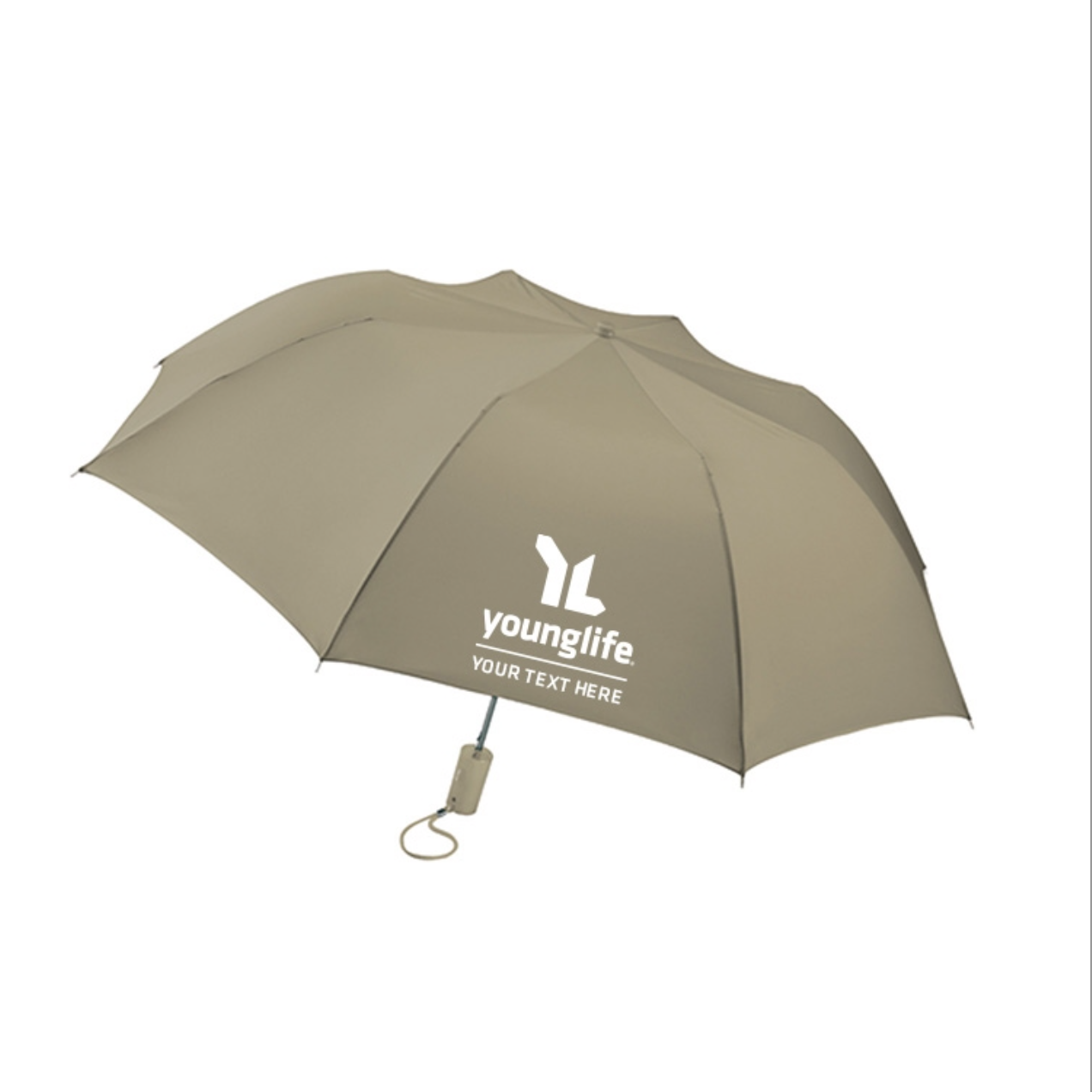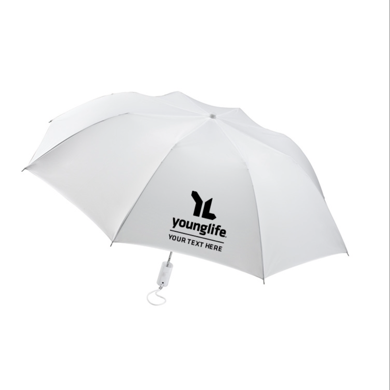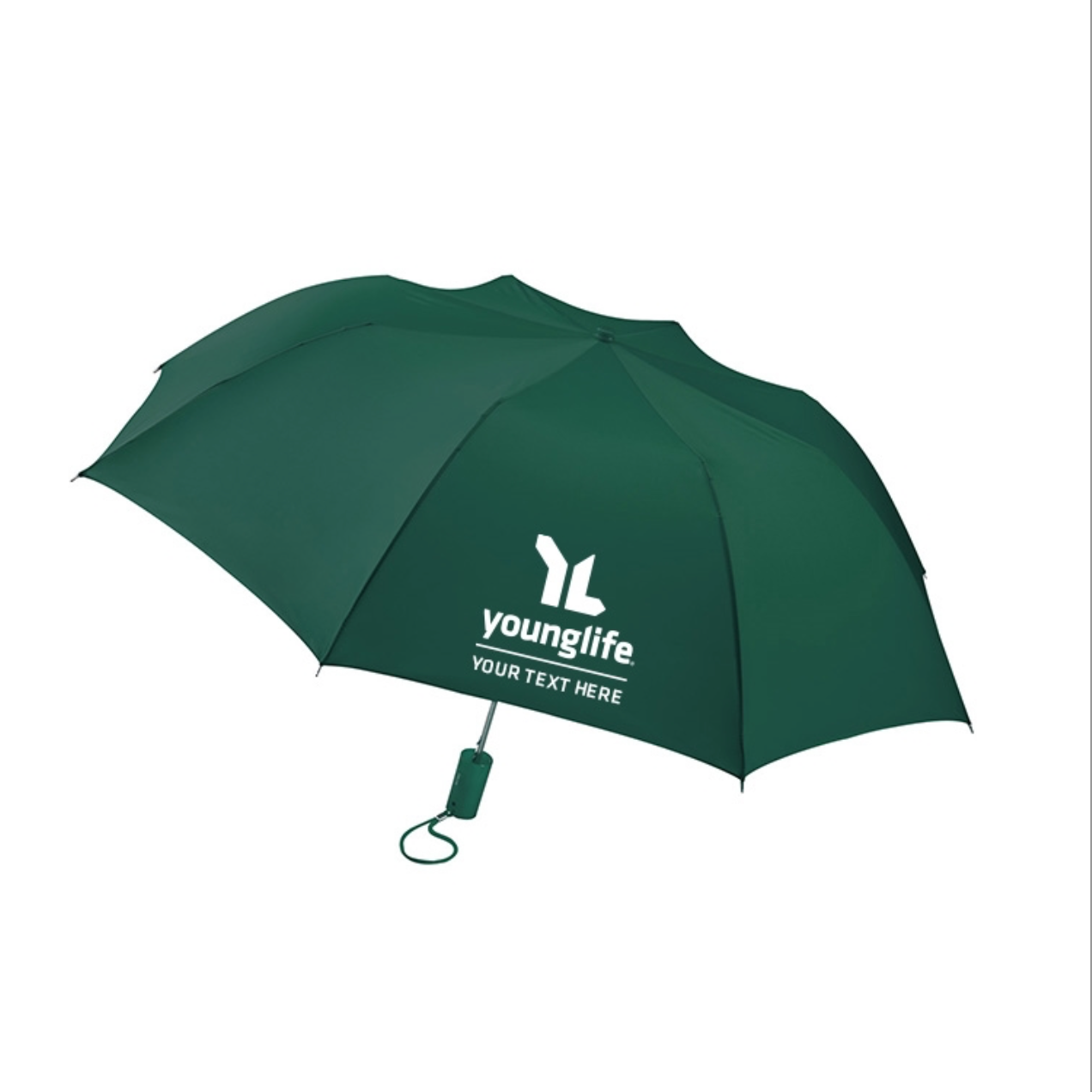 Automatic opening. Nylon canopy with matching color case. 2-section folding metal shaft. Ergonomic matte black plastic handle with wrist strap. Folds to 15" long. Features Young Life logo and customizable text.