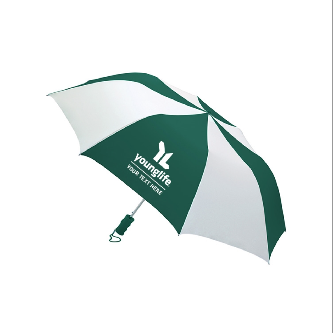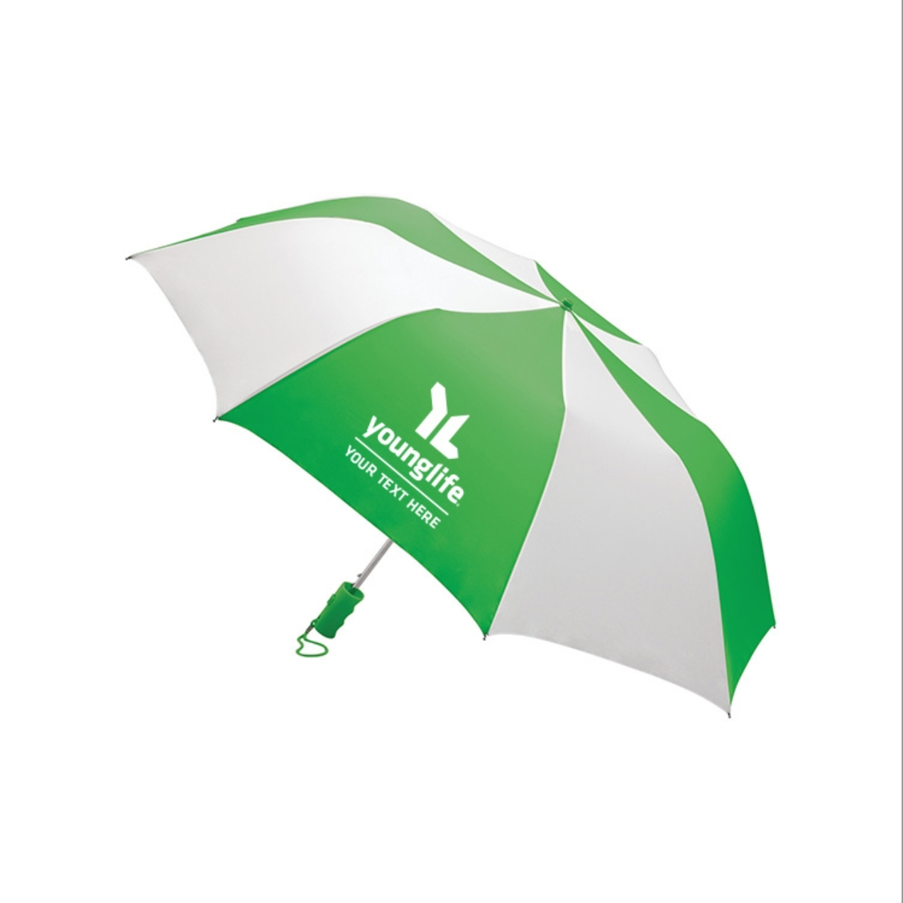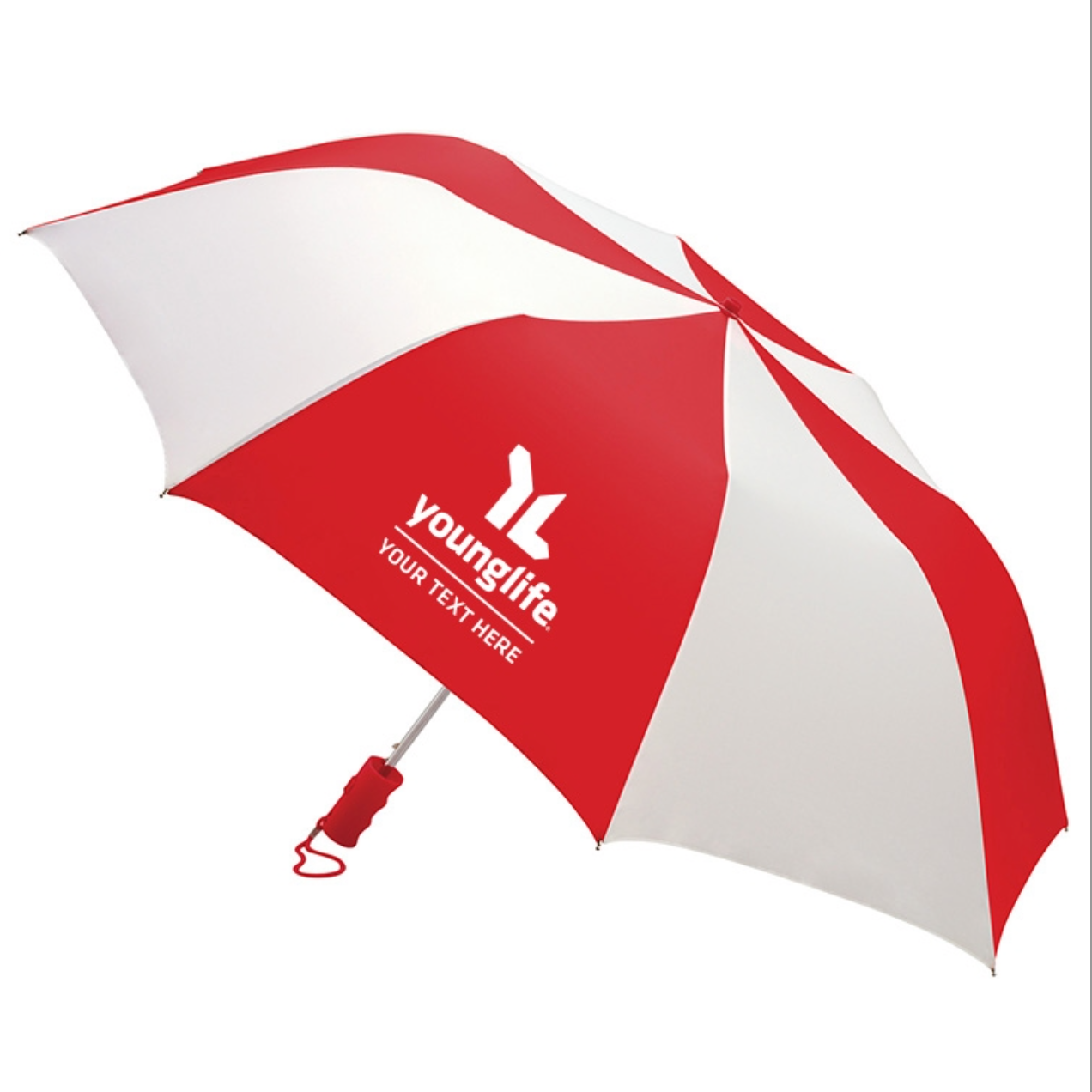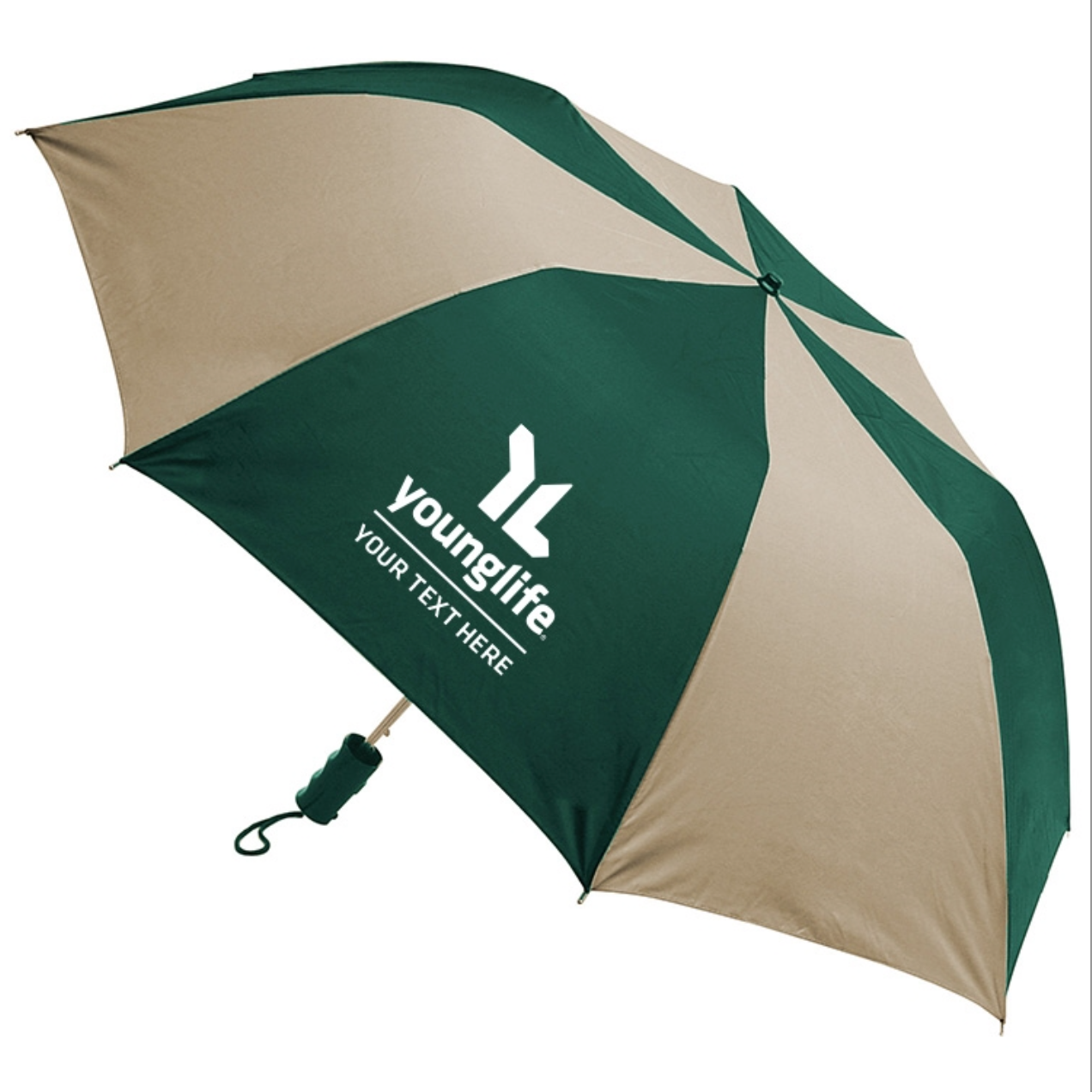 Automatic opening. Nylon canopy with matching color case. 2-section folding metal shaft. Ergonomic matte black plastic handle with wrist strap. Folds to 15" long. Features Young Life logo and customizable text.