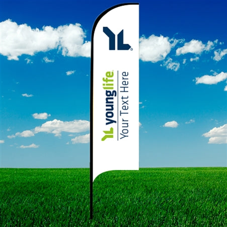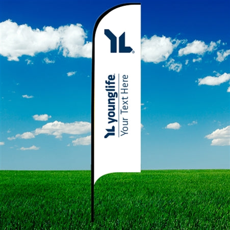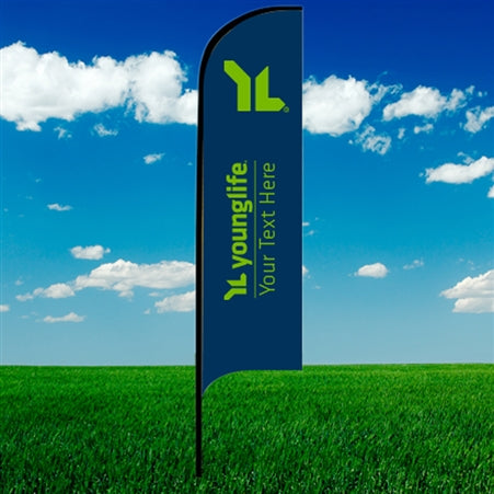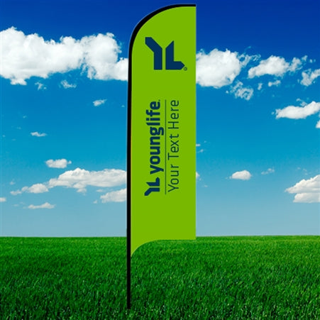 The 8 foot Promo Flag is the perfect way to make a BIG statement. Bring this flag to every event for even better branding and visibility! It's a single sided, full-color print so we can put ANYthing on this product. We can also change any of the colors on the flag. Email us your school colors and mascot, a photo of your last trip to camp - contact us and let us show you how great your banner will look!