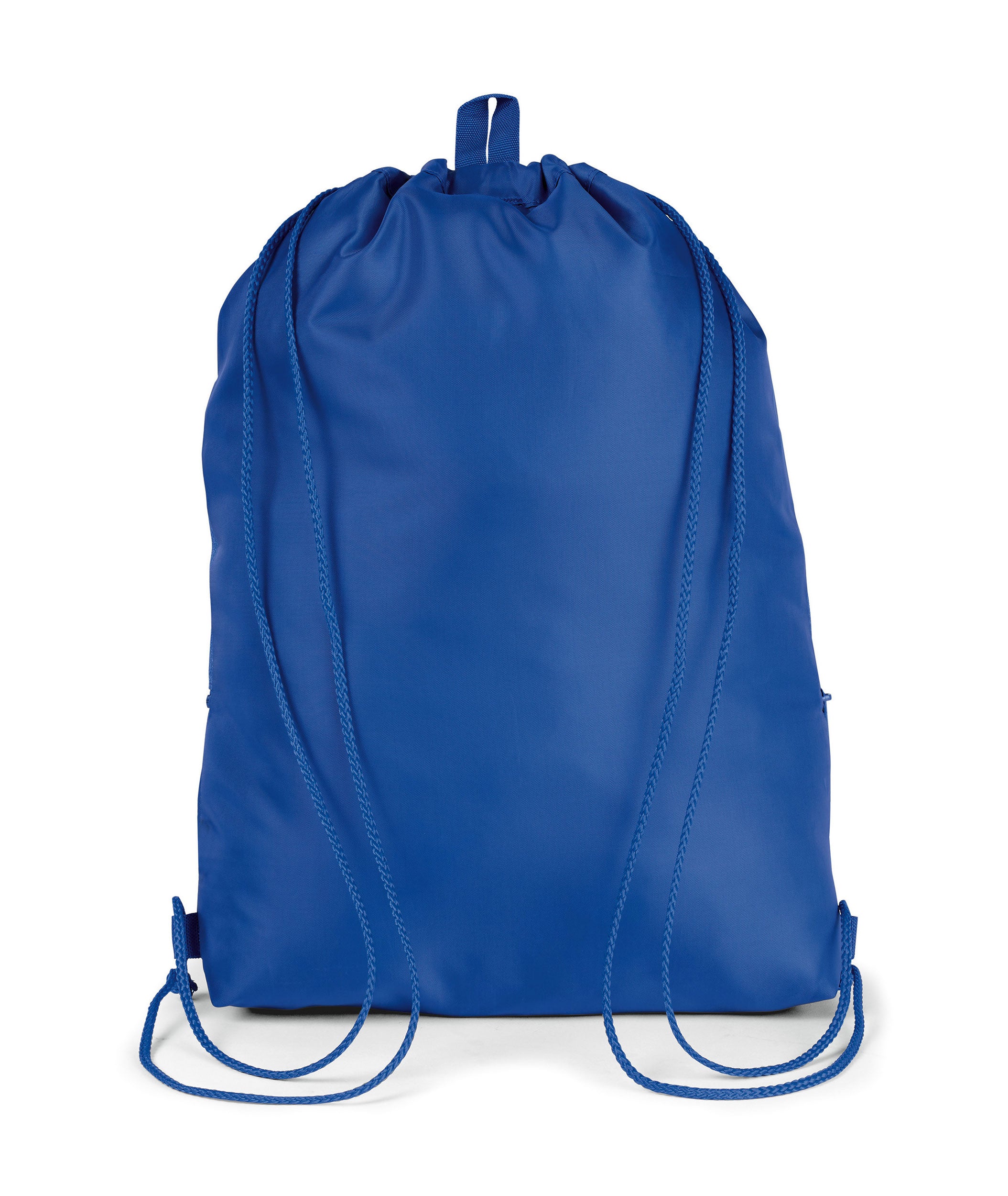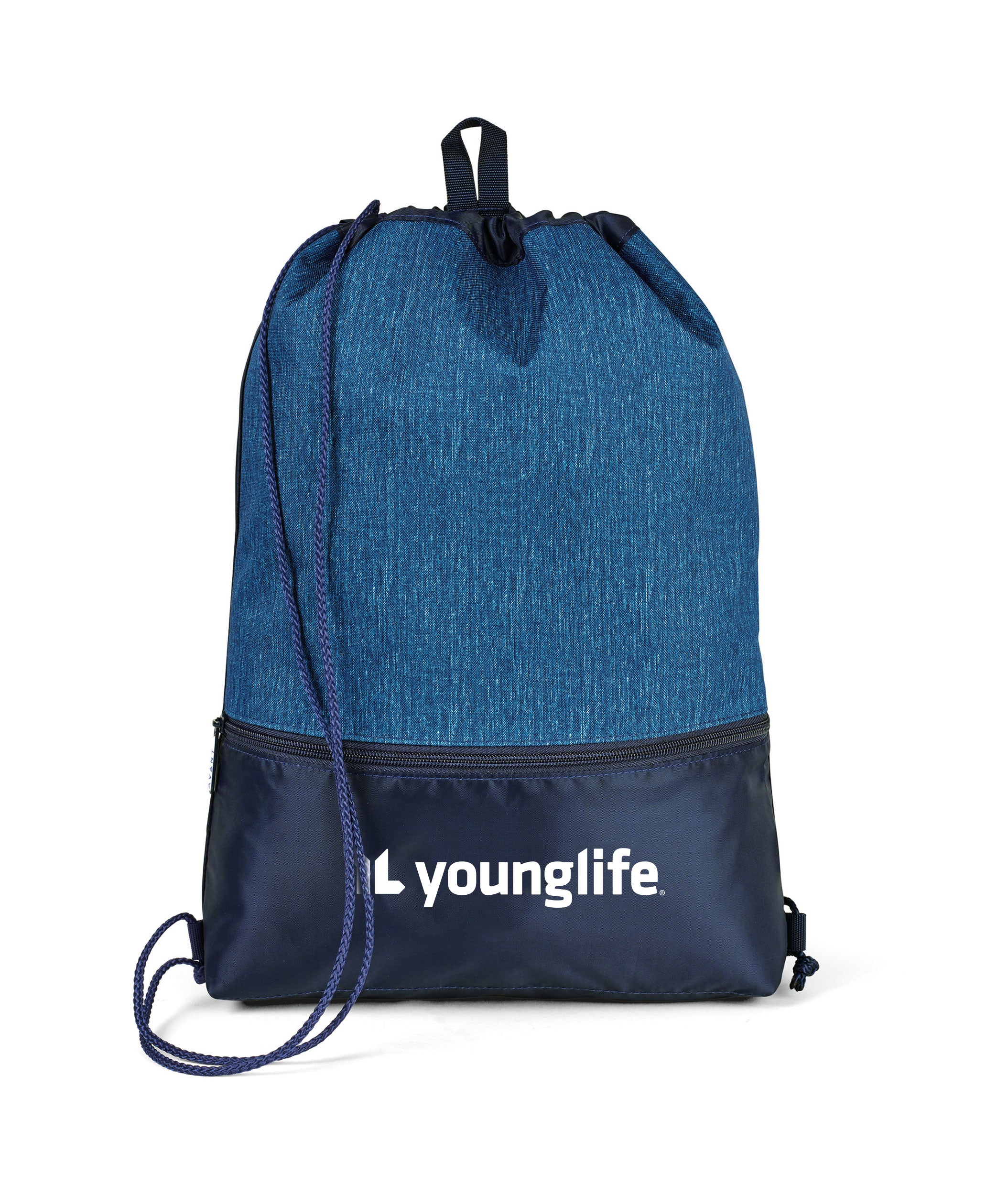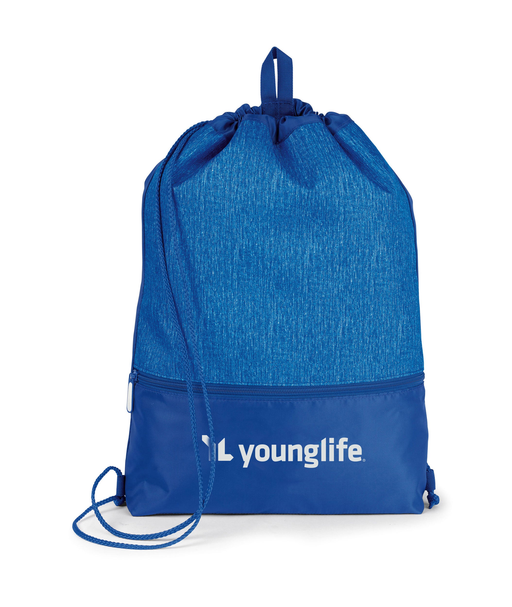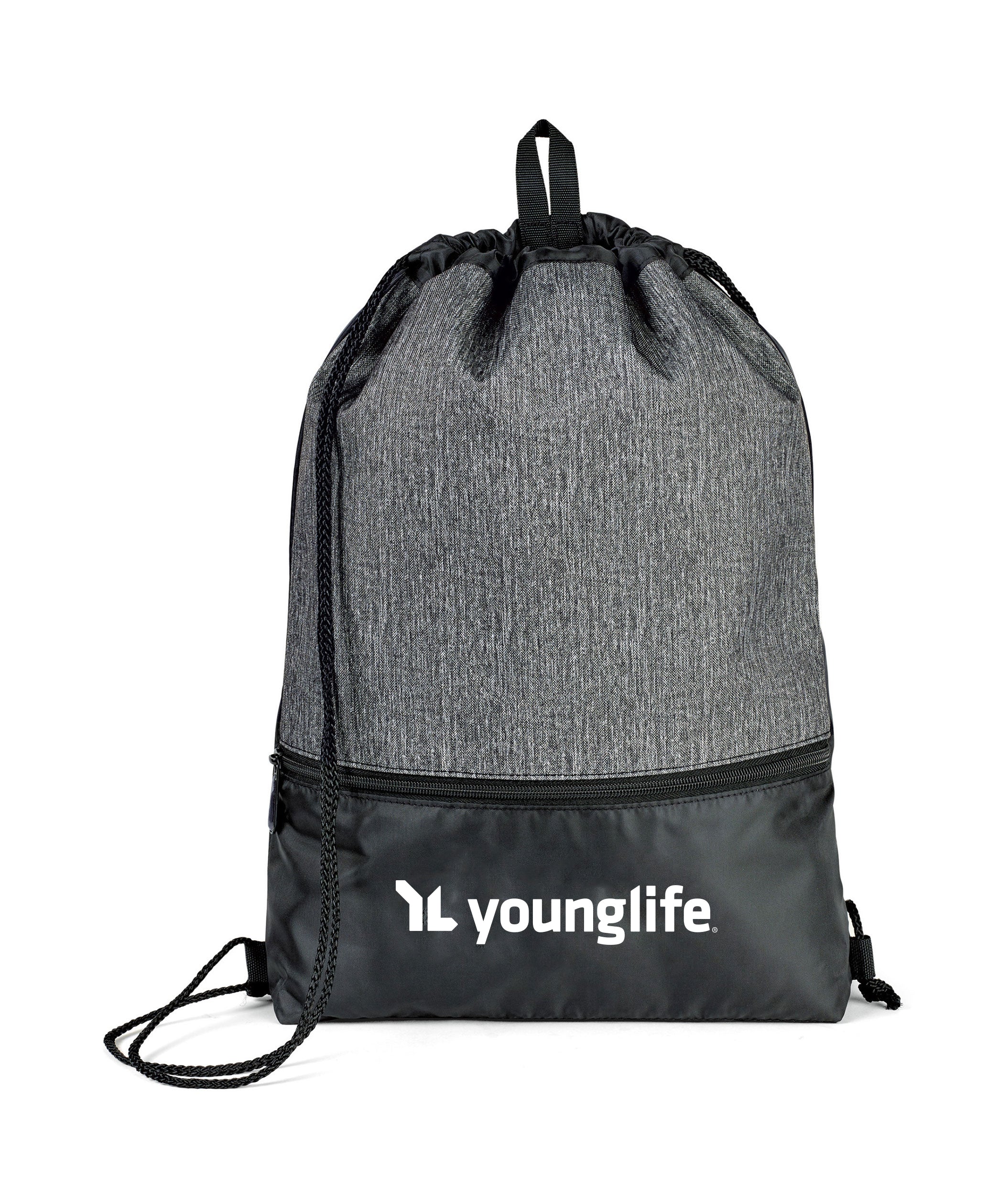 Cinch pack bag with T-gusset sides, front zippered pocket and top locker loop.