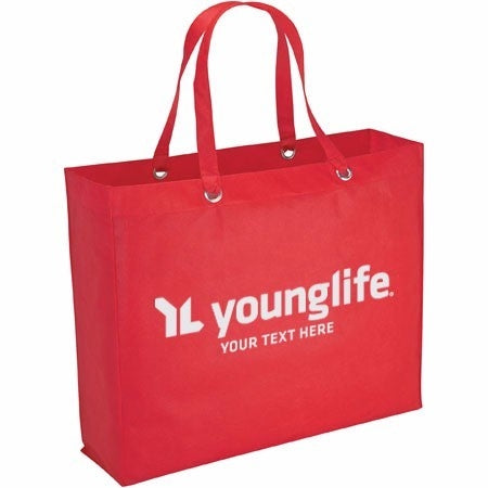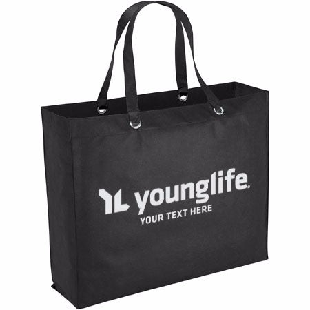 Open main compartment with double 23" handles reinforced with metal grommets featuring the Young Life logo and customizable text. Reusable and a great alternative to plastic bags.