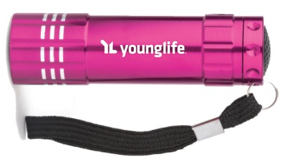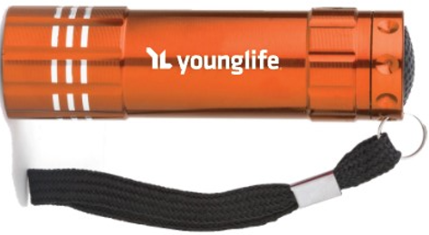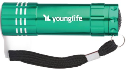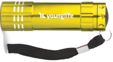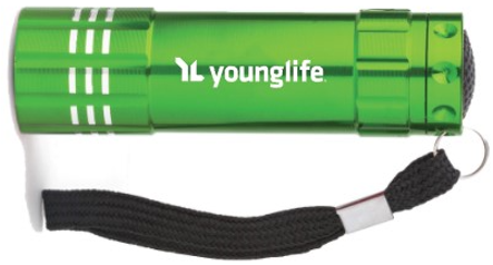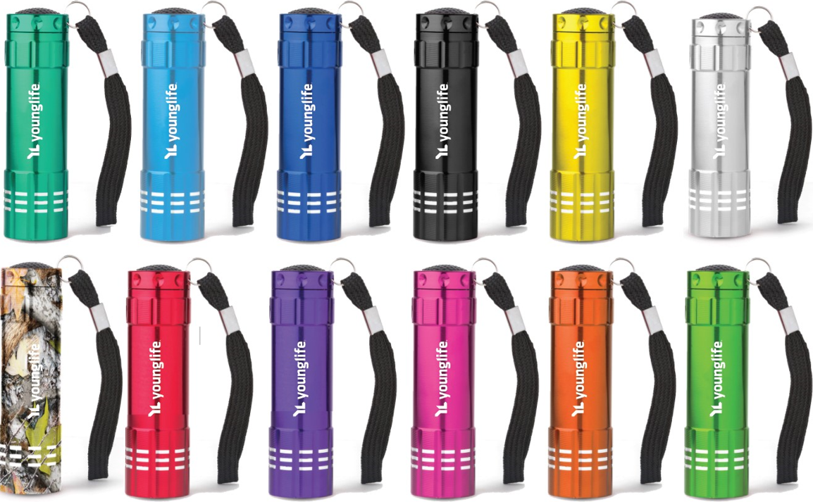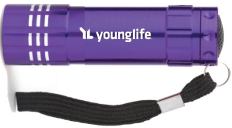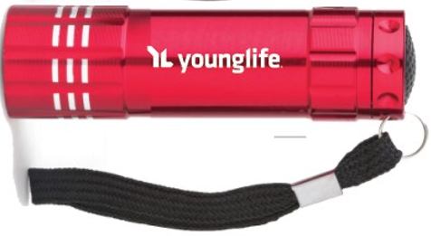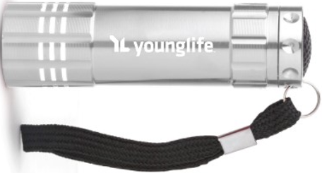 LED flashlight with nine bright white bulbs and black wrist strap. Aluminum construction with lightweight rich enamel colored finish body with metallic silver tip accent. Decorative dimple and ribbed accents, easy to use on/off push button. 25 lumen. Requires 3 AAA batteries (batteries included).