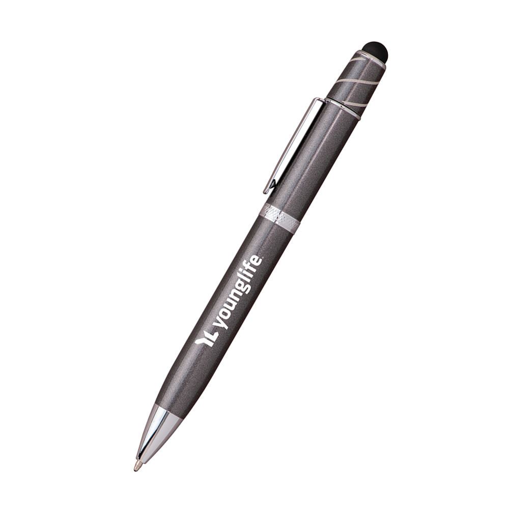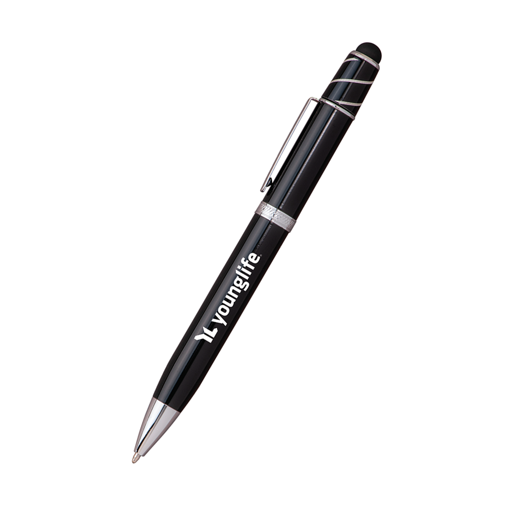 Let your stress whizz away with this fun executive pen! This twist retraction metal stylus pen features a fun fidget spinner on top that whizzes around with a flick of your thumb. Jumbo barrel for ergonomic comfort and black anti-fraud ink for writing excellence. Engraved silver imprint and etched center band.