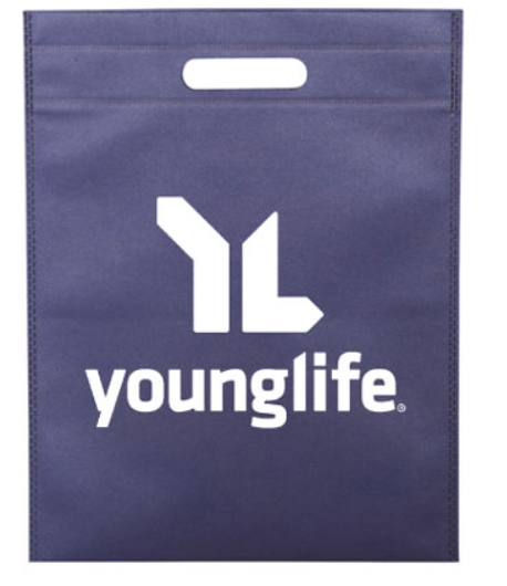Open main compartment. Die-cut handle. Reusable and recyclable. Great alternative to plastic bags for gifts, fundraisers and giveaways. Features Young Life logo. 14" H x 11" W