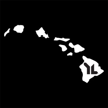 Window decal in the shape of New Hawaii. YL logo cut out. 3" decal