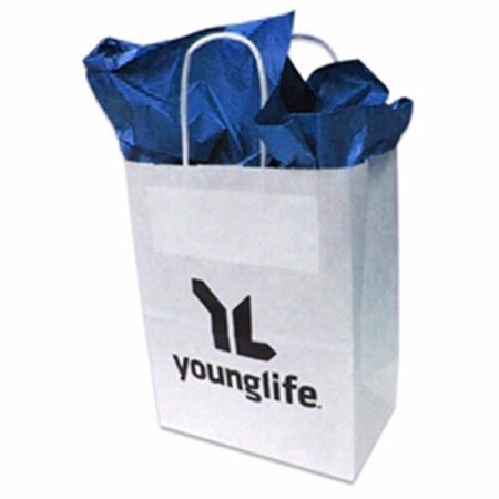 This durable paper bag is perfect for holding lots of small gifts. Featuring the Young Life logo in bold print and handles for convenience, it's a definite must-have at your next event! 10"W x 13"H x 5"D. Tissue paper not included.