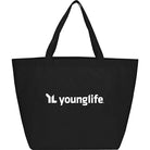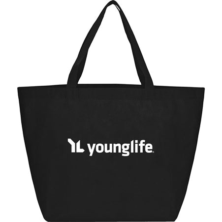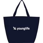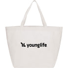 Grand compartiment principal ouvert avec deux poignées renforcées de 50 cm (20 po) ornées du logo Young Life. Réutilisable et recyclable. Dimensions : 33 cm (H) x 50 cm (l) x 20 cm (L).