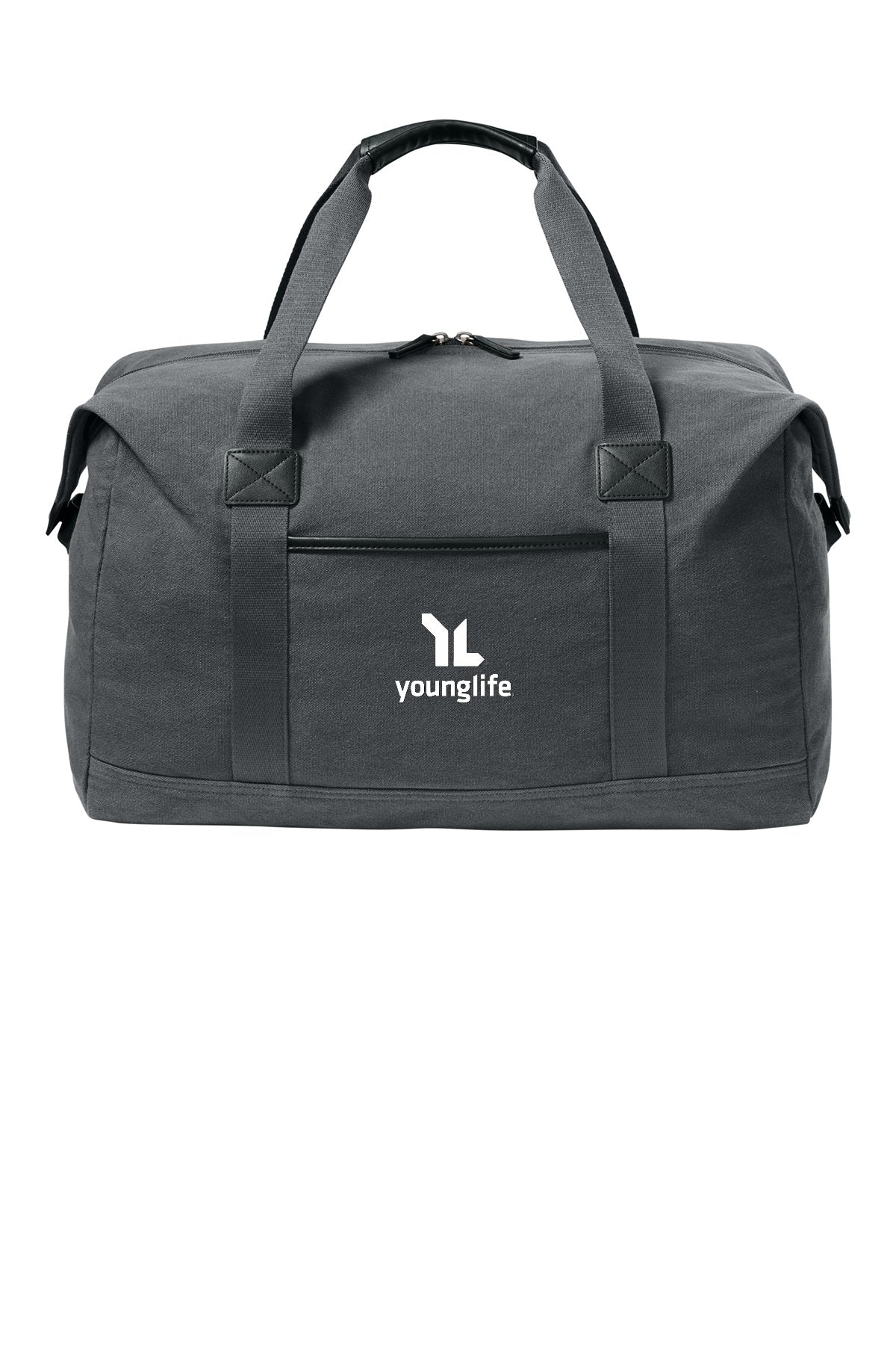- Faux leather trim on web grab handles, outside pocket and side snaps