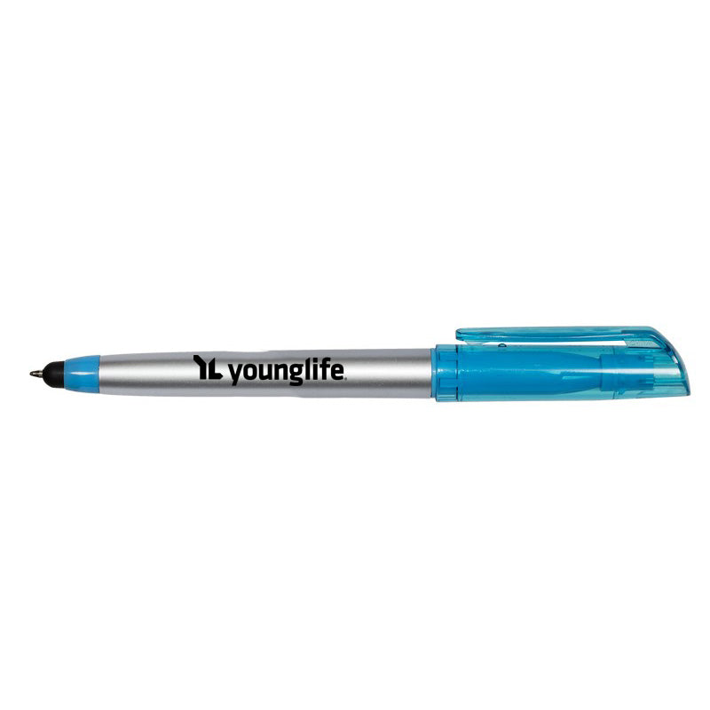 - Multi-function silver barrel writing instrument is a twist pen with stylus and highlighter.
